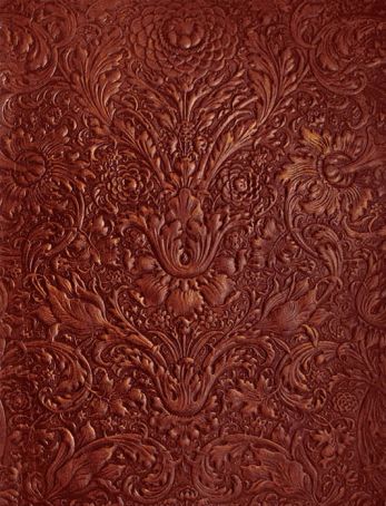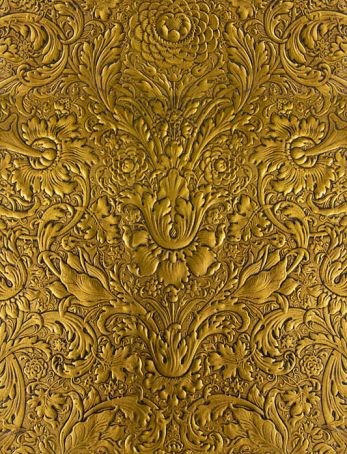 Wallpaper embossed using antique copper plates and patinated by hand. Wallcovering use.