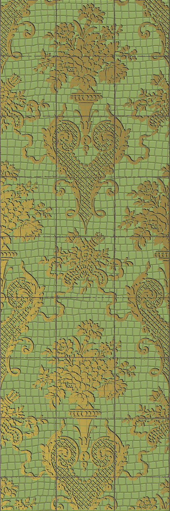Wallpaper patinated by hand, embossed using antique copper plates and printed using ancient woodblocks (classified Historical Monuments). All "Damas" design can be printed on any background shown in this collection. Sold by the meter.