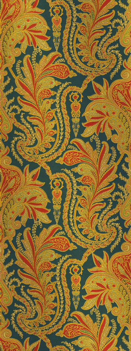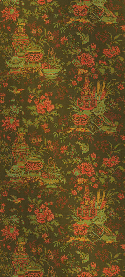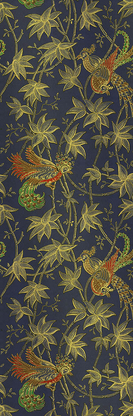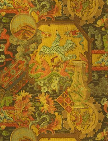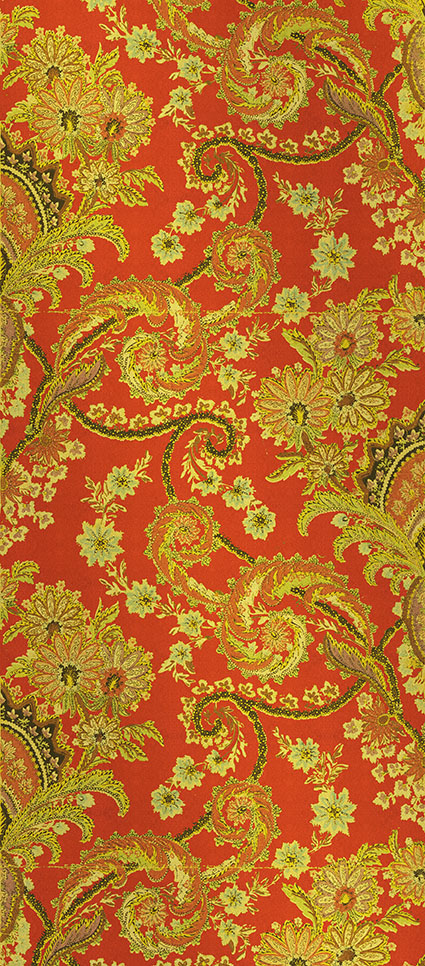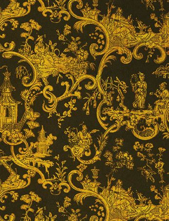Archive documents printed on hand-brushed golden backgrounds. Any document can be customized according to the customer's colours. Also available as upholstery. Sold in rolls.